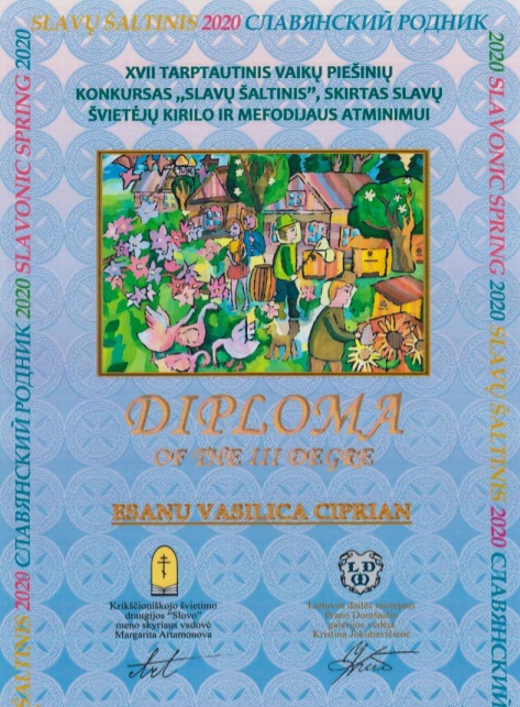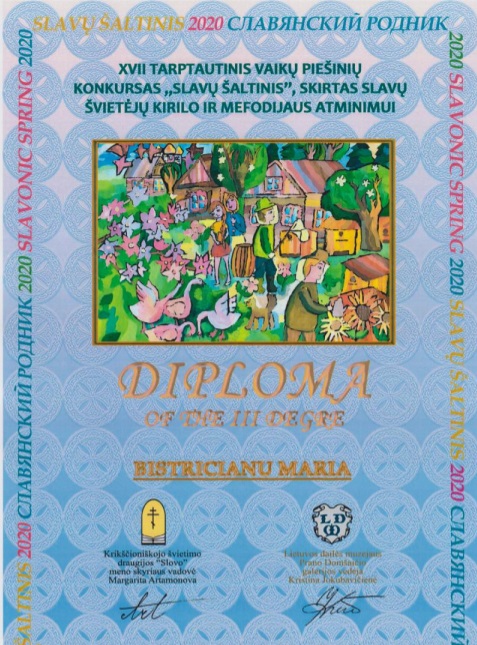 În luna aprilie a.c. , elevii claselor de Patrimoniu cultural de la Seminarul Teologic Ortodox „Veniamin Costachi” de la Mănăstirea Neamț, au participat la cea de-a XVII-a ediție a „Slavonic spring”, concurs internațional de artă, dedicat sfinților Chiril și Methodie, organizat în Klaipeda – Lituania. Icoanele trimise de către elevii noștri, coordonați de prof Țârdea Dan, au impresionat organizatorii, care le-au acordat titlul de “Laureat” precum și următoarele: Premiul I, Isache Cristina Maria clasa a XI-a și Ungureanu Nicolae clasa A X-a, Premiul II Horneț Daniel Mihai clasa a X-a și Lupu Mihail Irinel clasa a XII- a, Premiul III Bistricianu Maria clasa a XI-a și Eșanu Vasilică Ciprian din clasa a XII-a.