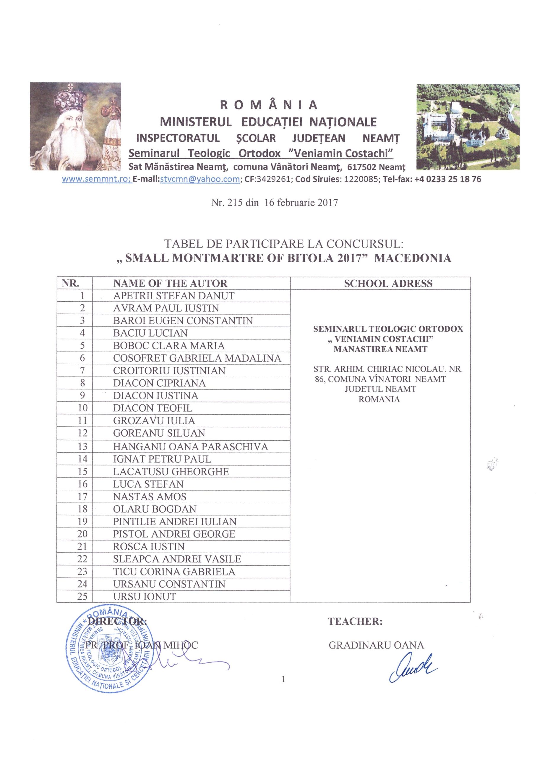 La sfârşitul lunii trecute, februarie 2017, la Bitola, în Macedonia, a inceput cea de-a XXXV-a ediţie a Festivalului de Artă plastică pentru copii “The small Montmartre of Bitola”. La festival au participat şi elevii clasei a XII a, ai Seminarului Teologic Ortodox „V. Costache” M-rea Neamt, cu o colectie de 25 de lucrari.